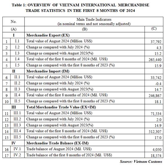 1. According to trade statistics of Vietnam Customs, in August of 2024, a 2.0% upwards in total external merchandise turnover of Vietnam was recorded as compared to the result of July 2024. Exports went up 4.3 %, to USD 37.79 billion and imports decreased 0.4%, to USD 33.74 billion in terms of month-on-month basis. As a result, there was a USD 4.05 billion surplus in Vietnam’s trade balance in this month.