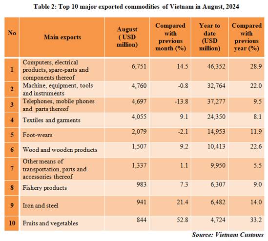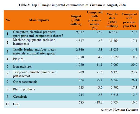 9. Trade statistics of Vietnam Customs shows that 4 biggest commodity groups in the first 8 months of 2024 were: computers, electrical products, spare-parts and components thereof; machine, equipments, tools and instruments; textile, leather and foot-wears materials and auxiliaries group; iron and steel.