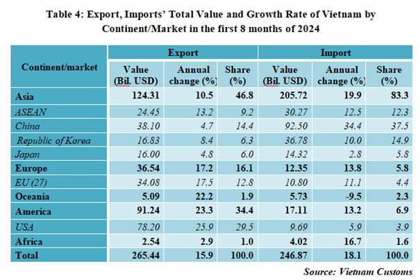 10. In the first 8 months of 2024, Vietnamese merchandise trade with trading partners in Asia was totaled USD 330.02 billion in value terms, which moved up 16.2% as compared to the same period of 2023. Trade-in-goods of Vietnam with America was followed, which reached USD 108.35 billion and increased by 21.6%. The values of other continents were Europe: USD 56.55 billion, up by 16.9%; Oceania: USD 10.82 billion, up by 3.0% and Africa: USD 6.56 billion, up by 10.9% in comparison with the same period of last year.