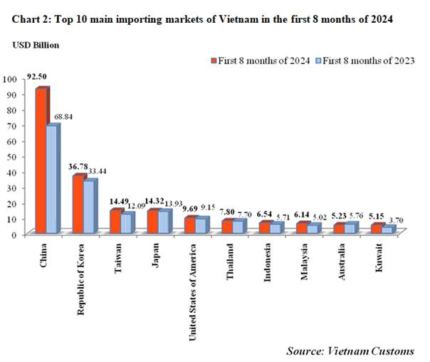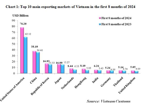 11. For Jan-Aug period, 4 exporting markets of Vietnam with turnover of over USD 16 billion were: The United States of America (reached USD 78.20 billion); China (reached USD 38.10 billion); Republic of Korea (reached USD 16.83 billion) and Japan (reached USD 16 billion).